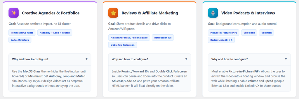 Activa Autoplay por Scroll y Muted. El video solo arrancará en silencio cuando el lector baje por el artículo. Esto no espanta al usuario y cumple las políticas de Google. Activa todos los botones de Redes (especial WhatsApp) e inyecta un código VAST de AdSense para cobrar por cada impresión.