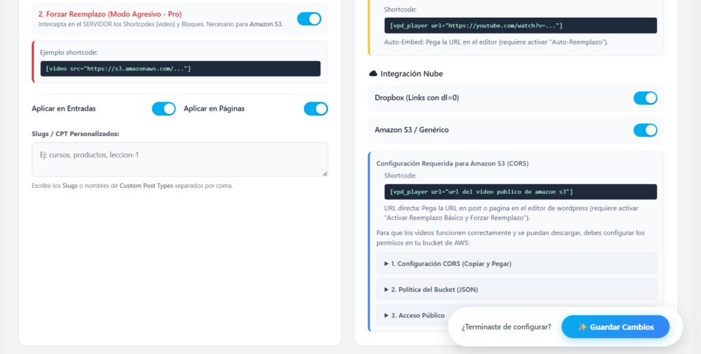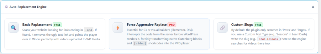 Fundamental para S3 o constructores visuales (Elementor, Divi). Intercepta el código desde el servidor antes de que WordPress lo pinte, transformando bloques nativos de Gutenberg y shortcodes en el reproductor VPD forzosamente.