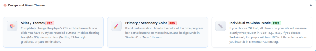 Si eliges “Global”, todos los reproductores de tu sitio medirán exactamente lo que pongas en “Tamaño” (ej: 75%). Si eliges “Individual”, el reproductor ocupará el 100% de la columna donde lo insertes en Elementor/Gutenberg.☁️ Integraciones (YouTube / Nube)