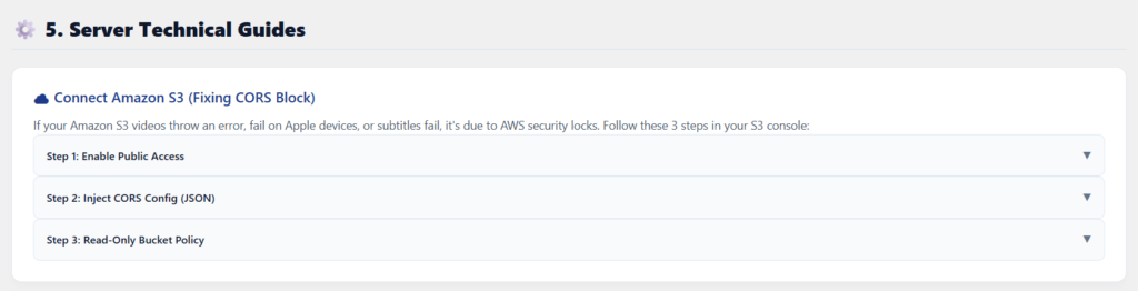 Si tus videos de Amazon S3 marcan error, no se reproducen en dispositivos Apple, o no cargan los subtítulos, es por el candado de seguridad de AWS. Sigue estos 3 pasos en tu consola de S3:Paso 1: Activar Acceso Público