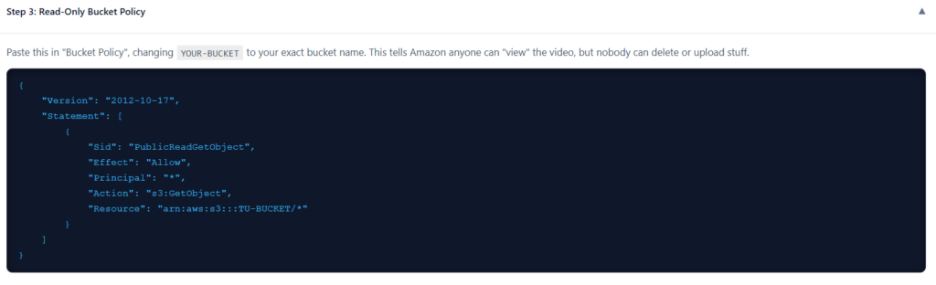 Pega esto en “Política de bucket”, cambiando TU-BUCKET por el nombre exacto de tu bucket. Esto le dice a Amazon que cualquiera puede “ver” el video, pero nadie puede borrarlo o subir cosas.