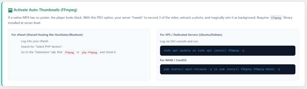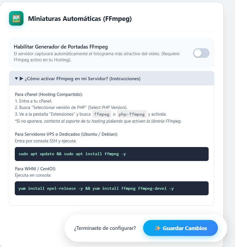 Si un MP4 nativo no tiene portada (poster), el reproductor se ve negro. Con esta opción PRO activa, tu servidor “viaja” al segundo 3 del video, extrae una foto y la pone de fondo mágicamente. Requiere la librería FFmpeg instalada a nivel servidor.