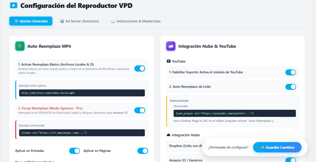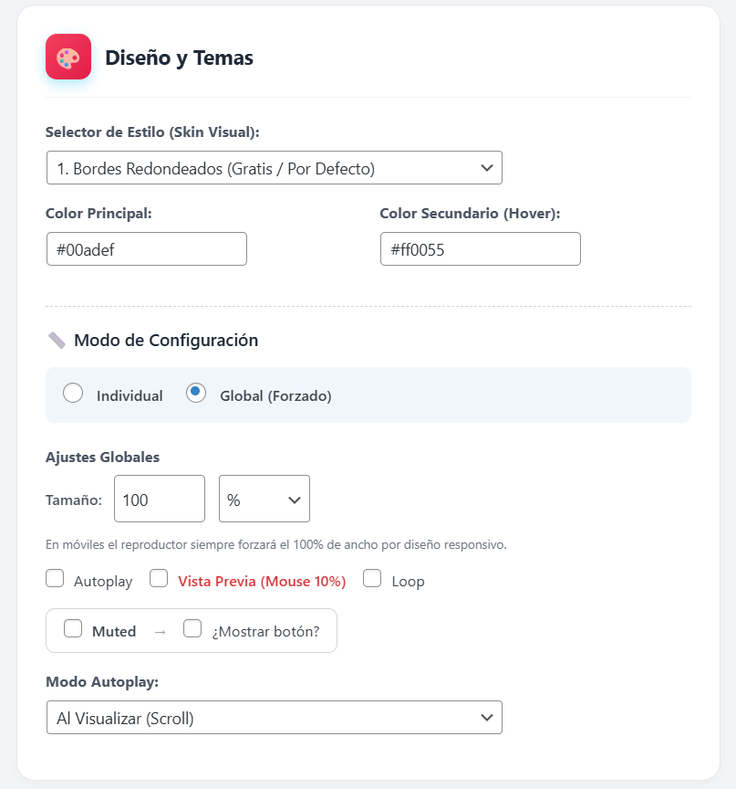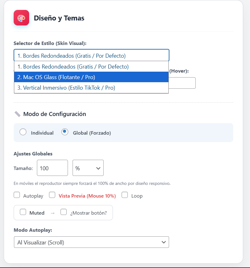 Por defecto el plugin solo busca en “Entradas” y “Páginas”. Si usas un Custom Post Type (ej: “Lecciones” de LearnDash), escribe el slug (ej: sfwd-lessons) aquí para que el motor empiece a buscar videos ahí también.🎨 Diseño y Temas Visuales