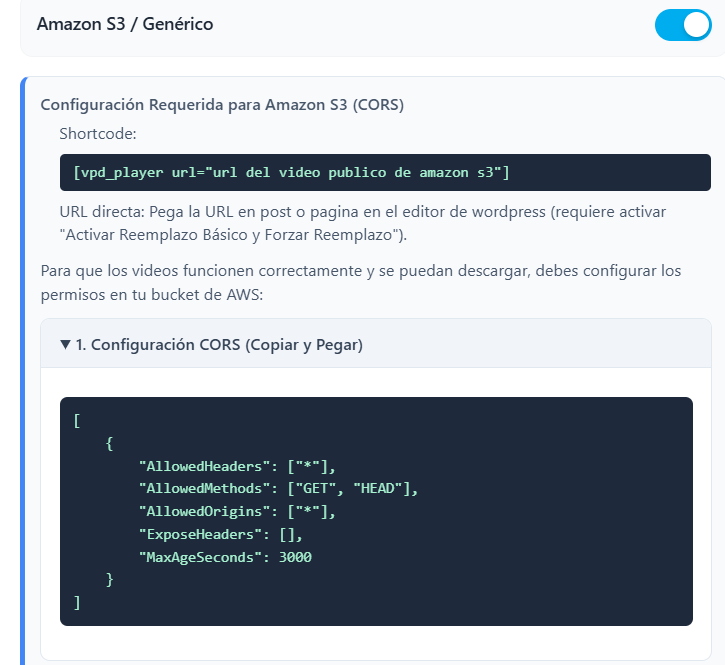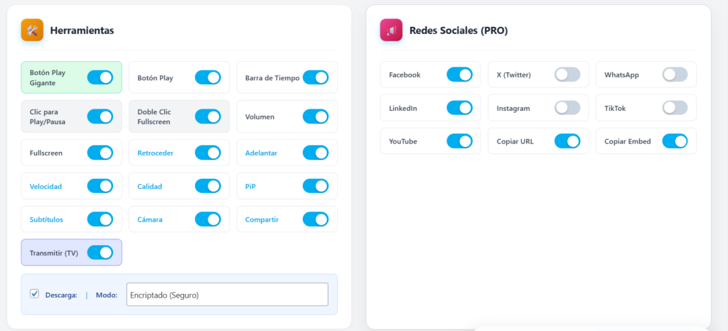 Aloja tus cursos en Amazon S3 para no saturar tu servidor. Activa la Descarga Encriptada (Blob); esto ocultará la URL de S3 en el código fuente, bloqueando extensiones como IDM que roban videos. Activa la Velocidad (vital para estudiantes) y apaga el botón Compartir.