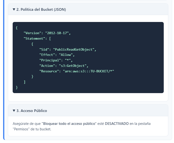 Ve a la pestaña “Permisos” de tu bucket de S3. Asegúrate de DESACTIVAR la opción “Bloquear todo el acceso público”.Paso 2: Inyectar Configuración CORS (JSON)
