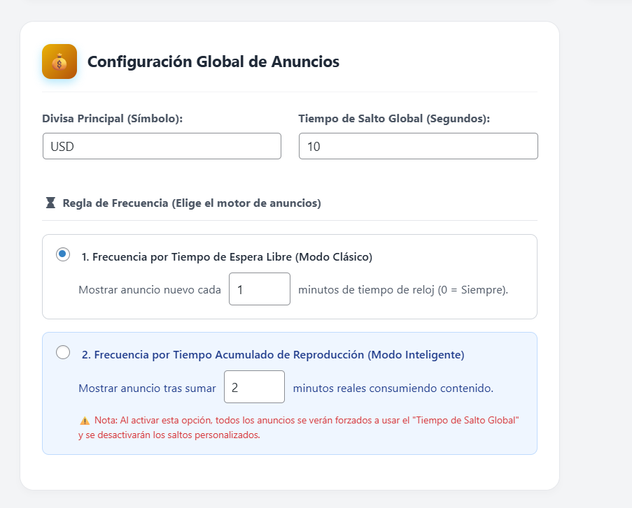 Si estás aprobado en una red publicitaria global, selecciona esta opción. Pega el código <script> de AdSense HTML y el sistema lo renderizará como un banner inferior. O pega la URL XML de VAST/IMA y el reproductor solicitará comerciales de video dinámicos directamente a Google.