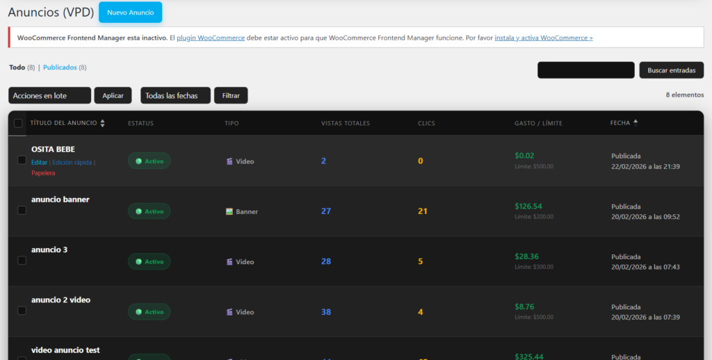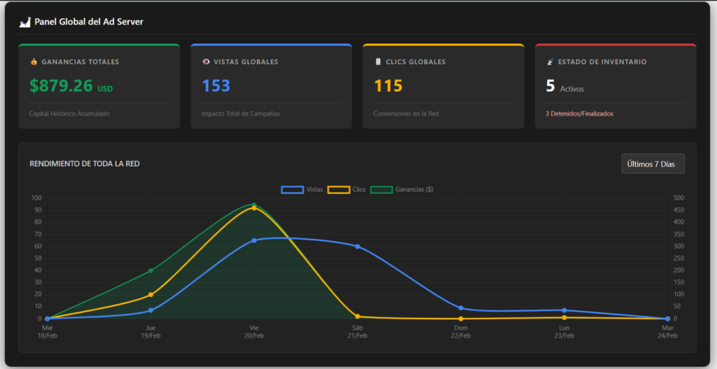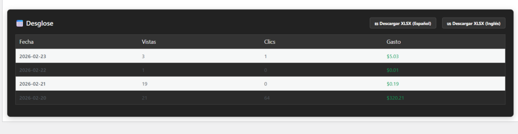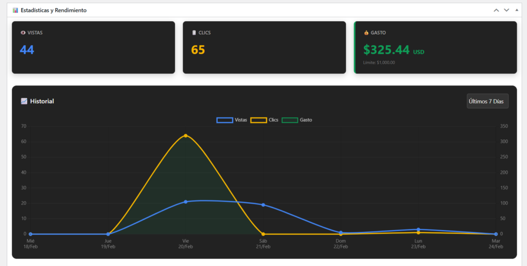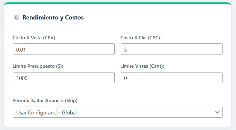 Cuando creas un anuncio, le asignas un CPV (Costo por Vista) y un CPC (Costo por Clic). Si tu cliente te pagó $100 USD, pones Límite: $100. El panel de la gráfica en tiempo real irá descontando centavos. ¡Cuando el anuncio gasta los $100, se apaga automáticamente y cambia a estatus “Límite Presup.”!