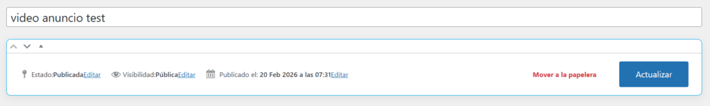 Sube tu video a la biblioteca de “Medios” y pega este shortcode en tu entrada:[vpd_player url="https://tusitio.com/video.mp4"]