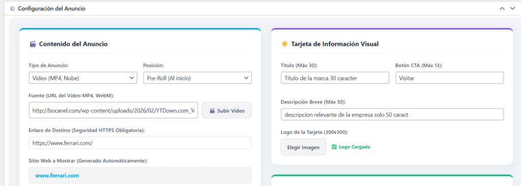 Sube un video corto (.mp4) de tu anunciante. Puedes configurarlo como Pre-Roll (inicia antes de tu contenido) o Post-Roll. El sistema te permite inyectar una Tarjeta de Información Visual (Título, Descripción, Logo 300×300 y Botón) que aparece súper impuesta, permitiendo al usuario dar clic y visitar la web del patrocinador.