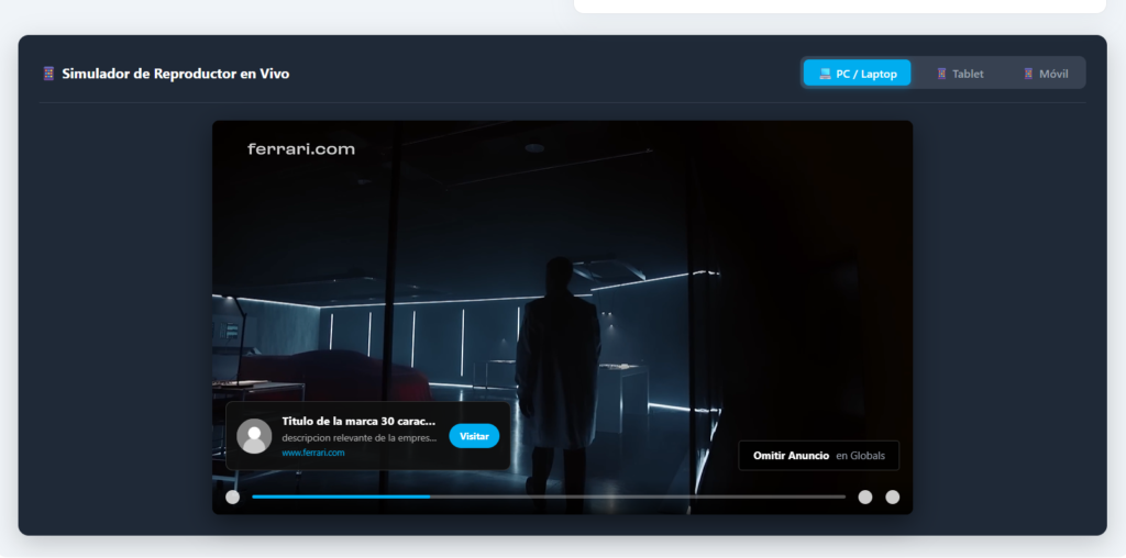 Sube una imagen (JPG/PNG). El reproductor la mostrará como una franja elegante en la parte inferior del video, abarcando el 90% del ancho, con un pequeño botón de cierre (X) y un contador regresivo. Ideal para monetizar películas o webinars largos sin pausar la reproducción.