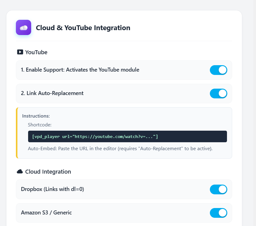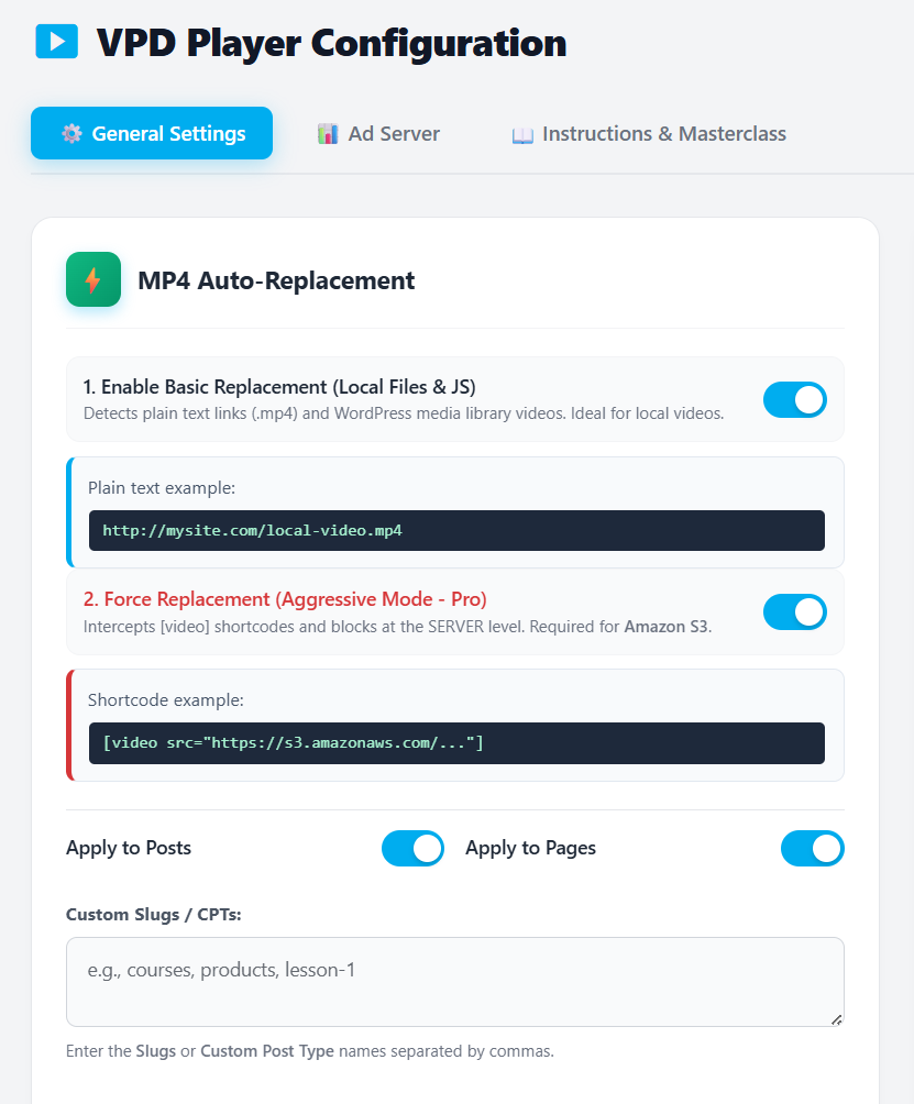 .mp4link or block into our sleek, dark, and fluid player. - Custom Slugs Support: Extend the automatic replacement to your Custom Post Types (like courses, portfolios, or products) by simply adding their slug.
