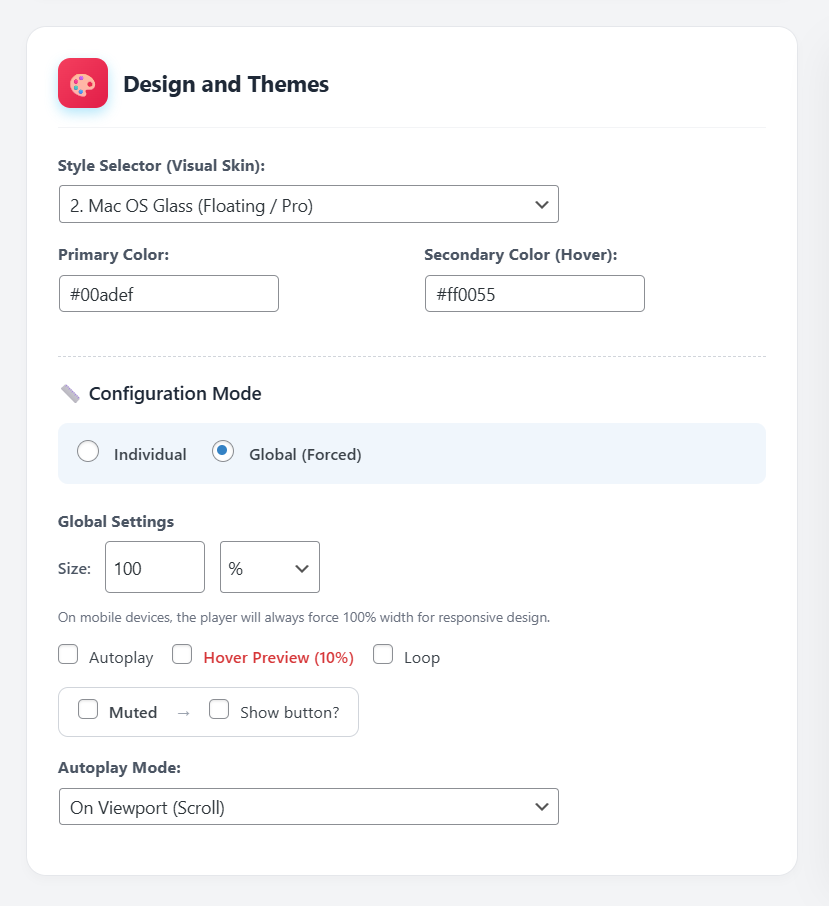 - Individual vs. Global Sizing: Choose whether players adapt automatically to their container (100% width) or strictly follow a global size setting across your site.