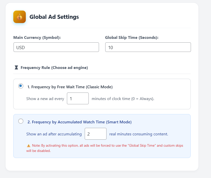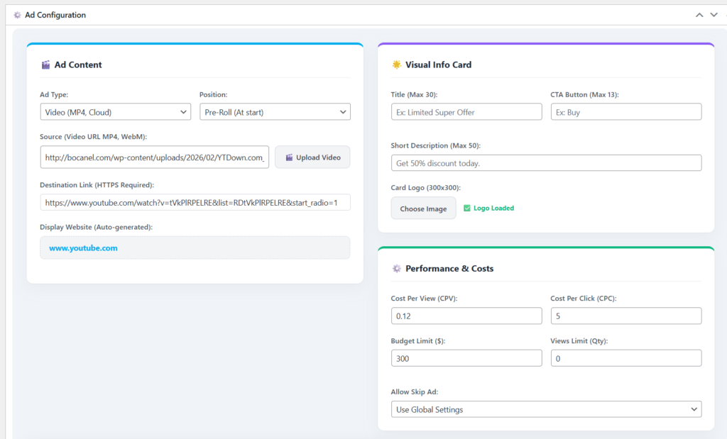 - Smart Frequency & Budget Control: Show ads based on accumulated watch time and automatically pause campaigns when they hit your exact CPV/CPC budget limit.