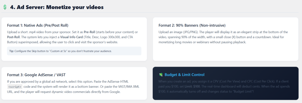 - Native Ads (Pre/Post Roll): Upload sponsor videos and inject a Visual Info Card with a “Buy Now” CTA pointing to your checkout.